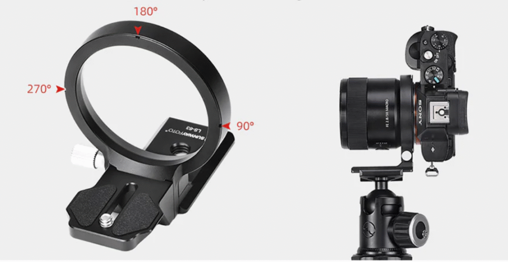 Un anillo para trípode es un soporte en forma de aro que se acopla directamente al cuerpo de la cámara, no del objetivo. Su función principal es permitirte rotar el cuerpo de la cámara 360 grados, de forma fluida y sin tener que soltar la cámara del trípode ni desmontar la placa de sujeción. Simplemente aflojas una rosca, giras la cámara para cambiar el encuadre de horizontal a vertical, y vuelves a apretar. Este simple movimiento te ahorra tiempo y esfuerzo, asegurando que el centro de gravedad de tu equipo se mantenga constante sobre la rótula.