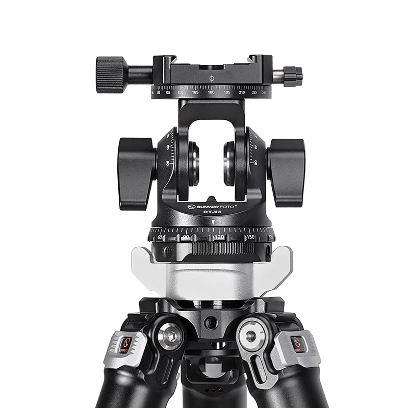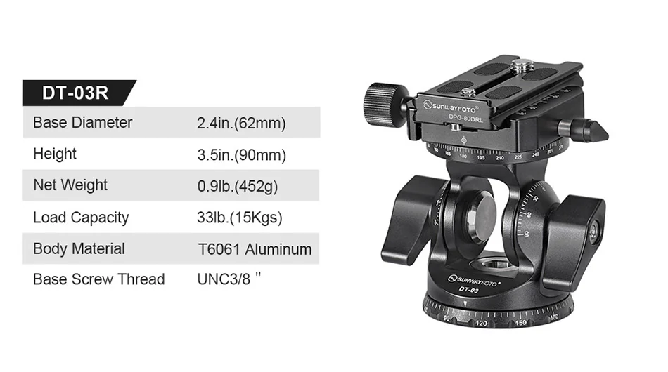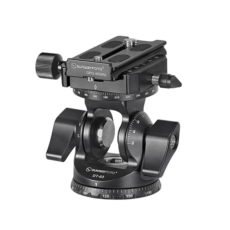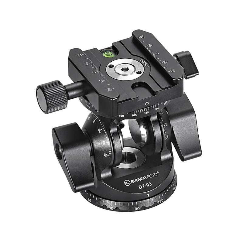 La Sunwayfoto DT-03R es una rótula con movimiento de inclinación (tilt) de hasta 90º en ambos sentidos, combinada con una base panorámica giratoria de 360º. Su construcción en aluminio aeronáutico mecanizado por CNC le otorga una gran robustez y durabilidad, manteniendo un peso muy contenido para su capacidad de carga.